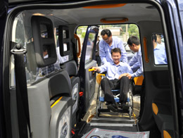 5月15日,北京首汽出租車公司服務于奧運會的首批無障礙出租車達到,并將于5月20日開始上路行駛。圖為工作人員展示將殘疾人乘客的輪椅推上奧斯汀出租車的過程。