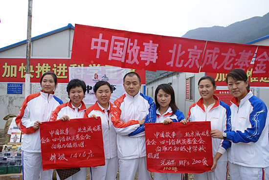 4016床棉被、1700套MP3和300張成龍奧運(yùn)專輯CD,這批由北京奧組委“中國故事”核心運(yùn)行團(tuán)隊(duì)、北京成龍慈善基金會,聯(lián)合四川省扶貧基金會捐贈(zèng)的慈善物資,于10月25日被送往綿陽市長虹集團(tuán)培訓(xùn)基地的北川中學(xué)、江油雁門鎮(zhèn)中學(xué)和劍閣縣政府。 據(jù)“中國故事”核心運(yùn)行團(tuán)隊(duì)工作人員介紹,在奧運(yùn)會舉辦前期,就曾邀請北川中學(xué)的部分師生前往北京參觀鳥巢、水立方以及參與奧運(yùn)文化活動(dòng),當(dāng)時(shí)他們與孩子們約定,奧運(yùn)會結(jié)束后,一定來四川看望他們。4016床棉被是2008的兩倍數(shù),象征著2008年北京奧運(yùn)和2008年北京殘奧會對四川地震災(zāi)區(qū)的關(guān)懷和援助。此次捐給災(zāi)區(qū)的物資費(fèi)用全部由成龍慈善基金會承擔(dān)。