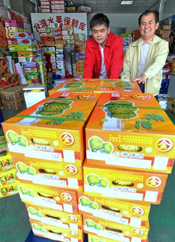 4月9日,在廈門中埔臺(tái)灣水果交易中心,經(jīng)營(yíng)臺(tái)灣水果的臺(tái)南縣楠西鄉(xiāng)農(nóng)會(huì)營(yíng)銷人員對(duì)剛運(yùn)到的水果進(jìn)行冷藏。 隨著兩岸“大三通”的基本實(shí)現(xiàn),臺(tái)灣水果在大陸的銷售量大大增加。據(jù)廈門檢驗(yàn)檢疫局統(tǒng)計(jì),2009年一季度廈門進(jìn)口臺(tái)灣水果1690多噸,已超過(guò)2008年全年進(jìn)口量。 |