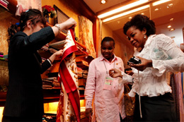 連日來,參加中非合作論壇的非洲代表利用會議間隙,開始近距離地接觸古老的中國文化,尤其對中國細膩精致的絲綢、瓷器制品愛不釋手。圖為兩位與會代表正在北京飯店絲綢商店挑選絲綢制品。