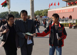 10月31日,一名青年(右一)在天安門城樓前向行人散發(fā)小廣告。當(dāng)日,提請北京市人大常委會審議的《北京市市容環(huán)境衛(wèi)生條例修正案(草案)》加大了對“小廣告”直接受益人的處罰額度,企業(yè)或者其它單位擅自利用或者組織張貼、涂寫、刻畫、噴涂、散發(fā)標(biāo)語、宣傳品和廣告進(jìn)行宣傳的,除沒收非法財物和違法所得外,“處1萬元以上10萬元以下罰款;情節(jié)嚴(yán)重的,處10萬元以上50萬元以下罰款”。