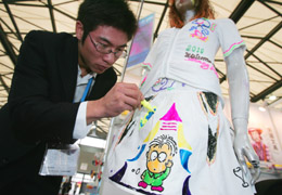 2006中國國際文具及辦公用品展覽會日前在上海開幕。來自中國、奧地利、比利時、法國、德國等22個國家和地區(qū)的500余家企業(yè)參展。圖為一位工作人員展示可以在衣服上進行彩繪的專用筆。
