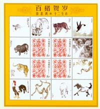 近百位著名畫家繪制的近百幅金豬“百態(tài)圖”及著名畫家郭利杰特為本珍藏冊精心創(chuàng)作的國畫“百豬圖”,被制成十版80枚生肖郵票、十版《百豬賀歲》國畫小全張。