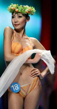 參加中國內(nèi)衣模特大賽的18號(hào)選手景麗在比賽中。 |