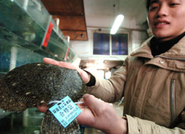 日前,帶有無(wú)公害標(biāo)簽、《無(wú)公害農(nóng)產(chǎn)品證書》、《無(wú)公害農(nóng)產(chǎn)品產(chǎn)地認(rèn)定證書》及相關(guān)部門提供的質(zhì)量檢驗(yàn)合格報(bào)告的多寶魚(yú),在禁售兩個(gè)月后重新出現(xiàn)在南京市場(chǎng)。圖為2月1日,南京市一家水產(chǎn)經(jīng)銷店的工作人員在展示帶有“環(huán)保無(wú)公害食品”合格證的多寶魚(yú)。