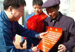 2月12日,中油吉林化建工程股份有限公司獎勵慰問高技能型農(nóng)民工活動啟動,60多名農(nóng)民工受到表彰,并先后在企業(yè)領(lǐng)導(dǎo)的陪伴下載譽(yù)還鄉(xiāng)。圖為在吉林省蛟河市天崗鎮(zhèn)崗子村,農(nóng)民工李彥軍(中)的父親李孝富(右)接收中油吉林化建公司送來的喜報。