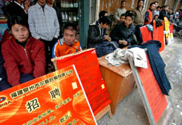 春節(jié)過(guò)后,記者在福建民營(yíng)企業(yè)發(fā)達(dá)、用工集中的泉州地區(qū)采訪發(fā)現(xiàn),不少企業(yè)遇到招工難問(wèn)題。據(jù)了解,泉州地區(qū)共需外來(lái)工約200多萬(wàn)人,但目前大多數(shù)企業(yè)缺工率在20%至30%。圖為石獅市許多企業(yè)在街邊排起招工攤位長(zhǎng)龍。 |