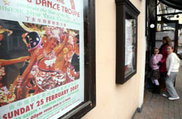 在英國海濱城市依斯特本,兩名英國小朋友隨家長走進劇場觀看中國貴州歌舞團的演出。(本報資料照片) |