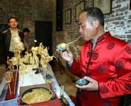 匯集世界各地20多項(xiàng)精彩節(jié)目的第18屆澳門藝術(shù)節(jié)將于5月5日至6月2日舉行。圖為來(lái)自河北的民間藝人在世界文化遺產(chǎn)——澳門廬家大屋舉行的藝術(shù)節(jié)新聞發(fā)布會(huì)上表演吹糖人技藝。