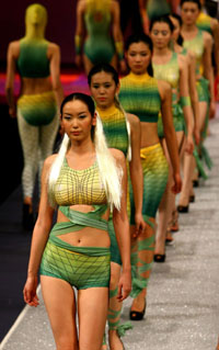 黑色高領(lǐng)的上裝,白底細(xì)黑邊組成雙腰的短褲,微微露臍,加上美麗的腰帶,凸顯了模特兒高挑傲人的身段,黑白兩色相間別具一格,表現(xiàn)了時(shí)尚動(dòng)感的一面。天藍(lán)色的內(nèi)衣也別具匠心,將抹胸與短褲用細(xì)細(xì)背帶連接起來(lái)簡(jiǎn)單地系在脖頸上,且在背帶上點(diǎn)綴了一些藍(lán)綠色的裝飾花,使女性看起來(lái)嫵媚脫俗,清麗動(dòng)人。帶有中國(guó)傳統(tǒng)特色的紅色系的內(nèi)衣一出場(chǎng)就吸引了觀眾的眼球,紅色的頸帶在同色的抹胸前交叉,后又輕松地系于頸后,紅白相間的雙腰短褲美觀大方,使整套內(nèi)衣顯得簡(jiǎn)單又具有濃郁的民族特色。 |