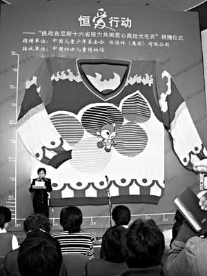 3月27日,在北京2008年奧運(yùn)會(huì)開(kāi)幕式倒計(jì)時(shí)500天之際,由恒源祥(集團(tuán))有限公司和中國(guó)兒童少年基金會(huì)聯(lián)合主辦的“恒愛(ài)心奧運(yùn)情——挑戰(zhàn)吉尼斯16省接力共編愛(ài)心大毛衣”活動(dòng)在全國(guó)婦聯(lián)大樓舉行了捐贈(zèng)儀式,與會(huì)者見(jiàn)證了世界最大純手工編織羊毛衫的誕生。