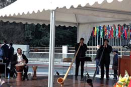 瑞士日內(nèi)瓦萬國(guó)宮廣場(chǎng)新廣場(chǎng)落成典禮上,人們通過踩高蹺和吹長(zhǎng)號(hào)等方式舉行慶祝活動(dòng)。本報(bào)記者:劉國(guó)遠(yuǎn) 攝