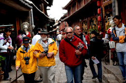 中外游客在云南省麗江市古城四方街參觀有800多年歷史的納西族古老宅居。本報(bào)記者:周重要