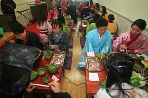 餐廳內(nèi)伸手不見五指,摸著坐、摸著吃,無論是白天還是夜晚,只要消費(fèi)者走入這種“黑暗餐廳”,就只能依靠觸覺、嗅覺、味覺去完成一場(chǎng)另類的“夜宴”。起源于瑞士的首家“黑暗餐廳”,誕生于1999年,發(fā)明者本意是為盲人提供就業(yè)機(jī)會(huì),沒想到卻在數(shù)年之內(nèi)風(fēng)行全世界。目前,北京、上海等城市都已有“黑暗餐廳”落腳,長春首家“黑暗餐廳”也將于本月底開業(yè)——據(jù)這里的經(jīng)理呂泰山介紹:“消費(fèi)者乍一進(jìn)來會(huì)不習(xí)慣,但一旦適應(yīng)了就會(huì)產(chǎn)生一種接近于心無旁騖的放松! 在長春的一家“監(jiān)獄酒吧”內(nèi),包房均為“牢房”,鐵窗、鐵鎖、鐵鏈、鐵桌、鐵凳一應(yīng)俱全,墻上煞有介事地刻有“犯人”懺悔的文字,“牢門”外的服務(wù)生穿著保安制服進(jìn)行“把守”;璋档墓饩下,消費(fèi)者如“囚犯”般置身其中。正在喝酒的曾小姐表示,自己平時(shí)常泡吧,但是在“監(jiān)獄”中泡吧還是第一次。“感覺挺新奇的,就是圖個(gè)刺激!彼f。 “好的,明天中午12時(shí)為您預(yù)留包房。大俠,后會(huì)有期!”——這是記者通過電話在長春一家“武俠酒店”訂餐后收到的答復(fù)。次日,記者來到這家酒店的時(shí)候,頓感自己如同置身金庸、古龍的武俠世界一般:服務(wù)員均為店小二打扮,包房名稱為“明教”“華山派”等武林門派,筷子叫“雙截棍”,湯匙叫“小李飛刀”,結(jié)賬稱為“收銀子”……據(jù)悉,“武俠酒店”在合肥、南京、廣州等地的分店生意也異;鸨 在各種各樣的“另類餐廳”中,人們不僅品嘗著美食,更從中體驗(yàn)到了不用以往的餐廳文化。