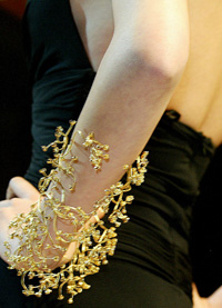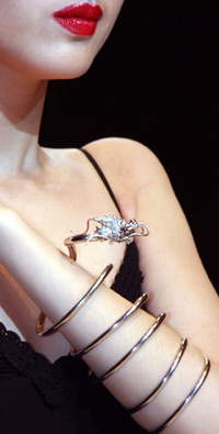 圖片說(shuō)明:上海國(guó)際首飾時(shí)尚節(jié)上展出的珠寶首飾。依次為:蛇形鉑金手鐲、銀質(zhì)項(xiàng)鏈、金制工藝手鐲和工藝項(xiàng)鏈。(本報(bào)資料照片) |