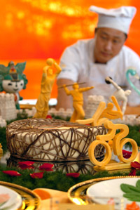 承擔(dān)北京2008年奧運會接待任務(wù)的北京老字號名店“全聚德”日前在其舉行的“奧運服務(wù)知識與技能競賽”活動中,推出創(chuàng)新面點和冷葷菜點,并展示了將在奧運期間提供給中外賓客的部分冷葷拼盤和面點樣本。圖為一名廚師在觀看用奶油蛋糕制成的奧運場館“鳥巢”模型。