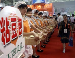 6月15日,綠色食品展區(qū)的一家參展企業(yè)的工作人員挎著籃子展示自己的產(chǎn)品。