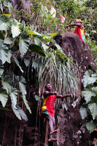 一名格林納達(dá)人在首都圣喬治Annadale瀑布前為游人進(jìn)行跳崖表演。圣喬治的旅游部門依托當(dāng)?shù)厣鷳B(tài)環(huán)境,開辟眾多旅游項目以吸引國外游客,促進(jìn)了旅游業(yè)的發(fā)展。