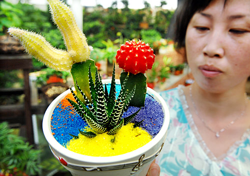 一位女士正在觀看一款鋪墊著彩砂的盆栽。近日,銀川花市上出現(xiàn)了一種鋪墊著彩色砂土和石子的盆栽植物,艷麗的彩色砂石為原本單調的綠色觀葉植物增添了別樣色彩。