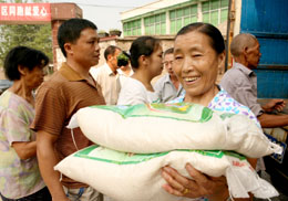 8月14日,四川省華鎣市永興鎮(zhèn)的災(zāi)民領(lǐng)取社會各界捐助的賑災(zāi)物資。當(dāng)日,由社會各界捐助的賑災(zāi)物資運送到華鎣市永興鎮(zhèn),并發(fā)放到災(zāi)民手中。今年7月,華鎣山區(qū)遭受山洪和泥石流襲擊,公路被毀,田地、房屋被淹,群眾生產(chǎn)生活一度陷入困境。 |