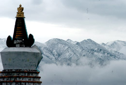 青海湖畔的佛塔與“雪山云海”奇觀相映成趣。 本報(bào)記者:侯德強(qiáng) 攝 |