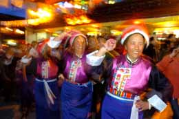 藏族大媽在香格里拉縣獨(dú)克宗古城歡跳“鍋莊”舞。本報(bào)記者:秦晴