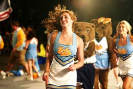 在旅游節(jié)的開(kāi)幕式上,來(lái)自美國(guó)加州大學(xué)洛杉磯分校的啦啦隊(duì)上場(chǎng)表演。本報(bào)記者:鄭悅 攝 |