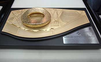 以北京奧運(yùn)會(huì)主體育場(chǎng)——國(guó)家體育場(chǎng)為造型的奧運(yùn)特許商品“鳥(niǎo)巢”金屬模型,9月19日起在北京、上海、廣州、沈陽(yáng)、青島等12個(gè)城市的16家?jiàn)W運(yùn)特許商品專賣店同步上市。 據(jù)北京奧組委相關(guān)人士介紹,“鳥(niǎo)巢”金屬模型是把國(guó)家體育場(chǎng)按照標(biāo)準(zhǔn)尺寸等比例縮小。該金屬模型包括了“鳥(niǎo)巢”及周圍地形、水系、訓(xùn)練場(chǎng)等,將“鳥(niǎo)巢”空間結(jié)構(gòu)和細(xì)節(jié)——如鋼架結(jié)構(gòu)、入口、臺(tái)階、看臺(tái)、賽場(chǎng)等的位置和形象非常精準(zhǔn)地表達(dá)出來(lái)。 模型有鍍金和鍍古錫兩種顏色,分為大、中、小三種型號(hào),價(jià)格從900多元到4000多元不等,其中大、中兩種型號(hào)限量發(fā)行。特別具有收藏意義的是,大、中號(hào)產(chǎn)品的金屬標(biāo)牌均由建筑“鳥(niǎo)巢”的剩余鋼材制成。 |