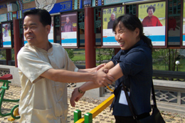 圣醫(yī)堂非藥物經(jīng)典療法研究院院長(zhǎng)盧奇峰正在用經(jīng)絡(luò)療法為一位咨詢者治療感冒。本報(bào)記者:周曉頻