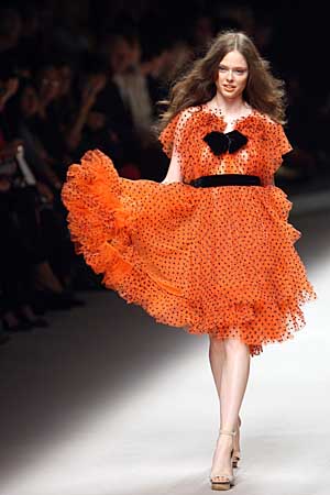 在法國首都巴黎舉行的2008年春夏時裝展上,一名模特在展示索尼亞·里基爾的時裝作品。