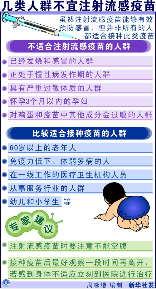 近期我國大部分地區(qū)開始持續(xù)降溫,感冒咳嗽的人不斷增加,專家建議,廣大市民可開始注射流感疫苗,在發(fā)病高峰期冬季來臨之前做好準(zhǔn)備。 云南省健康教育專家熊世杰說,流感是由流行性感冒病毒引起的急性呼吸道傳染病,常表現(xiàn)為發(fā)熱、頭痛、肌痛、乏力、鼻炎、咽痛、咳嗽、腸胃不適等,發(fā)病后持續(xù)時(shí)間較長,還容易引發(fā)心肌炎、哮喘、肺炎等并發(fā)癥,因此那些本身就患有慢性病和體質(zhì)虛弱的老年人及幼兒尤其需要注意。 記者從昆明市衛(wèi)生防疫站了解到,流感病毒大致分為甲、乙、丙等類型,其中甲型和乙型流感對人類威脅較大。而流感流行具有一定的季節(jié)性,像我國北方地區(qū)的發(fā)病高峰一般在冬季,而南方一般在夏季和冬季,但只要是氣溫急劇下降的時(shí)候也會流行。例如這兩天昆明天氣驟然變冷,感冒發(fā)燒的人明顯增多,恢復(fù)起來也要比平時(shí)慢。 熊世杰說,流感疫苗注射后,大都會出現(xiàn)流鼻涕、渾身疼痛等癥狀,這表示人體的免疫系統(tǒng)對疫苗起了反應(yīng),持續(xù)幾天后就會好轉(zhuǎn)。此外,注射一次流感疫苗并不代表終生免疫,因?yàn)榱鞲胁《镜膩喰秃芏啵磕炅餍械牧鞲胁《痉N類不同,最好每年注射一次,而且必須聽從醫(yī)生建議,有針對性地進(jìn)行接種。