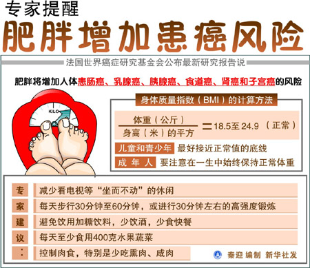 這項(xiàng)研究成果綜合了全球7000項(xiàng)癌癥成因研究,歷時(shí)五年得出。其中最早的記錄可追溯至20世紀(jì)60年代。研究小組成員是來(lái)自各國(guó)的21名知名專家。 人們已經(jīng)知道,肥胖不利于癌癥患者。但研究發(fā)現(xiàn),飲食、體重與癌癥的關(guān)聯(lián)遠(yuǎn)超人們想像。研究者列出了六種受肥胖影響較大的癌癥,稱已找到“令人信服的”證據(jù)能證明二者確有關(guān)聯(lián)。六種癌癥分別為:食道癌、胰腺癌、直腸癌、子宮癌、腎癌、更年期乳腺癌。 世界癌癥研究基金會(huì)10年前的一份研究報(bào)告只列出了一類可能與體內(nèi)脂肪有關(guān)的癌癥,如今的新報(bào)告多列出了另外五類癌癥。 保持正常體重是專家建議中的重要一條。研究小組負(fù)責(zé)人邁克爾·馬爾莫說(shuō):“我們建議,在健康范圍內(nèi),人們應(yīng)盡可能保持苗條,并在成年后把控制體重變成一種習(xí)慣! 英國(guó)《每日電訊報(bào)》援引英國(guó)癌癥研究會(huì)的數(shù)字說(shuō),若控制體重得當(dāng),全英每年將有1.2萬(wàn)人逃脫癌癥魔爪。