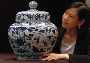 | 明嘉靖青花《庭院嬰戲圖》蓋罐,拍品估價為3000萬港元。新華社記者 黃本強