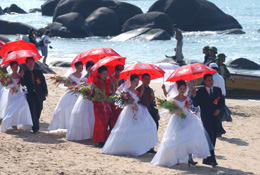 據(jù)一組織集體婚禮的網(wǎng)站負(fù)責(zé)人介紹,從去年5月組織第一屆集體婚禮起,該公司已經(jīng)組織了180對新人在三亞舉行集體婚禮。隨著婚禮形式的不斷豐富,通過電話和網(wǎng)站咨詢的年輕朋友也越來越多。 在該公司推出的婚禮產(chǎn)品中,記者看到了分界洲島海底婚禮、三亞灣畔草坪婚禮、黎族婚宴等形式多樣的獨(dú)特婚慶內(nèi)容。 三亞市旅游部門有關(guān)人士表示,隨著三亞旅游的不斷發(fā)展,婚慶產(chǎn)品成為三亞旅游產(chǎn)業(yè)鏈條中蓬勃發(fā)展的一環(huán)。一系列結(jié)合三亞環(huán)境和當(dāng)?shù)匚幕幕槎Y形式不斷應(yīng)運(yùn)而生,受到現(xiàn)代年輕人的歡迎。