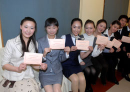 中國(guó)國(guó)際航空公司“300名奧運(yùn)空乘”招募暨“奧運(yùn)空乘新星”評(píng)選活動(dòng)日前拉開帷幕。據(jù)介紹,此次“奧運(yùn)空乘”招募主要是為2008年北京奧運(yùn)會(huì)運(yùn)輸提供服務(wù)。圖為參加國(guó)航“奧運(yùn)空乘”招募的應(yīng)聘者展示復(fù)試通知書。 |