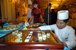 北京市崇文區(qū)飲食協(xié)會(huì)日前舉辦了“與奧運(yùn)同行、為奧運(yùn)助力”特色創(chuàng)新菜品展示技能大賽,40余家參賽餐飲企業(yè)就創(chuàng)新菜品和提升奧運(yùn)接待服務(wù)水平進(jìn)行了交流。圖為北京便宜坊烤鴨店廚師在準(zhǔn)備名為《棋韻》的參賽菜品。