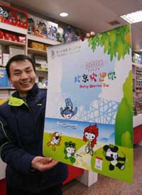 由北京奧組委授權(quán)制作的2008年“奧運(yùn)掛歷、臺歷”近日在北京上市,吸引了不少顧客前來選購。