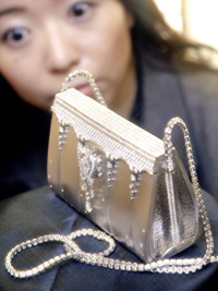 日前,在日本東京一家百貨公司舉辦的“新年幸運手提包”發(fā)布會上,員工展示了一款白金手提包。這款用2182顆鉆石裝飾的手提包售價約為180萬美元。