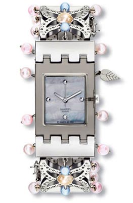 Swatch的這款令人炫目的方形淑女腕表配有別致的表鏈,中間一列鏈節(jié)為精鋼海星造型。每一顆海星的中央都鑲嵌有一粒淺粉色珍珠,并綴有白色與彩色珍珠掛墜和一片小小的鋼葉。本報資料照片