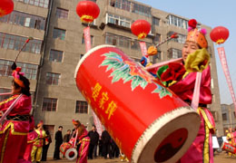 1月9日,蘭州市民舞起太平鼓歡慶廉租房住宅小區(qū)奠基。