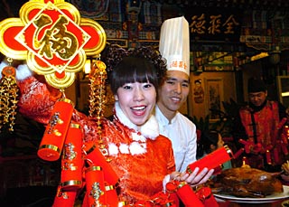 “周年旺相”是“西夏烤羊背”、“一團(tuán)和氣”是“炸麻團(tuán)”、“年年高升”是“香煎年糕”……記者采訪中發(fā)現(xiàn),各大酒店飯店為迎合消費(fèi)者討“口彩”的需要,在菜名上大做文章。什么“恭喜福如!薄凹t運(yùn)聚寶盆”“發(fā)財(cái)好利來”等等菜名,無不透露出喜慶和濃濃的“年味”。