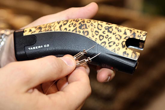 在剛剛結(jié)束的國(guó)際消費(fèi)電子展上亮相的一款時(shí)尚防身槍——新款泰瑟槍?zhuān)蛟S能夠滿(mǎn)足時(shí)尚女性的需求。 這款泰瑟槍的首要功能是防衛(wèi),能發(fā)射5萬(wàn)伏特的高壓電脈沖。被擊中者神經(jīng)和肌肉系統(tǒng)暫時(shí)癱瘓,失去行動(dòng)能力。其不凡之處在于它內(nèi)置有一臺(tái)mp3音樂(lè)播放器,存儲(chǔ)器容量1G。新華社/法新 | |