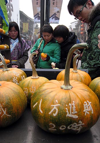 伴隨春節(jié)到來(lái),一些刻上了吉祥語(yǔ)句的小南瓜亮相杭州市河坊街。這些既可以食用又可以當(dāng)作擺設(shè)的小南瓜吸引了很多市民購(gòu)買。