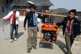 2月12日,貴陽市花溪區(qū)水利局的三名工作人員和村民一起,將發(fā)電機(jī)抬進(jìn)高坡鄉(xiāng)掌已村。貴陽市花溪區(qū)高坡鄉(xiāng)是當(dāng)?shù)厥苣齼鰹?zāi)害最大的鄉(xiāng)之一。由于恢復(fù)正常供電仍需一段時(shí)間,花溪區(qū)組織采購(gòu)60臺(tái)汽油發(fā)電機(jī),免費(fèi)送到受災(zāi)村莊,解決群眾生活用電。