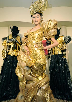 一名模特在日本首都東京展示一件綴滿金幣的裙裝。這件綴有325枚奧地利金幣的服裝售價為2870萬日元(約合26.5萬美元)。新華社/法新