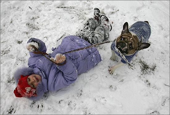 在烏克蘭首都基輔,一個小女孩騎著她的寵物狗在白雪覆蓋的公園里盡情玩耍。新華社/路透