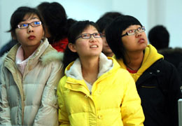 2月29日,三位女生在招聘會上觀看招聘信息。當日,“春風送崗位”2008沈陽市首屆女性專場招聘會在沈陽市就業(yè)和社會保障服務中心舉辦。本次專場招聘會共有百余家用人單位參加,提供就業(yè)崗位約3000個,涉及的崗位主要有部門經(jīng)理、文員、教師、餐飲服務員、家政服務員等。