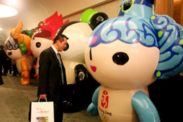 由國家旅游局牽頭組成的中國旅游代表團日前在日本東京舉辦了以“中國奧運旅游觀光年”為主題的大型中國觀光推介活動。圖為參觀者觀看2008年北京奧運會吉祥物“福娃”。