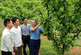 近年來,江西重點(diǎn)發(fā)展以“南橘北梨”為格局的果業(yè)基地。目前,全省果業(yè)種植規(guī)模達(dá)610萬畝,產(chǎn)量160萬噸,帶動了廣大農(nóng)戶致富。圖為江西德安縣河?xùn)|鄉(xiāng)后田村果業(yè)大戶張泗煌(右一)在給果農(nóng)講解早熟梨的栽培技術(shù)。