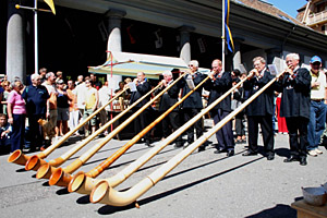 | 圖為在瑞士沃韋舉行的第15屆街頭藝人節(jié)上,幾位藝人在街頭吹響阿爾卑斯號角。新華社記者 楊京德